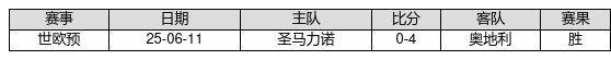 奥地利 VS 圣马力诺两队近10年的交战次数为1场,奥地利1胜0平0负,赢球概率为100.0%,平局概率为0.0%,输球概率为0.0%。