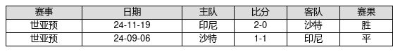 印尼 VS 沙特两队近10年的交战次数为2场,印尼1胜1平0负,赢球概率为50.0%,平局概率为50.0%,输球概率为0.0%。