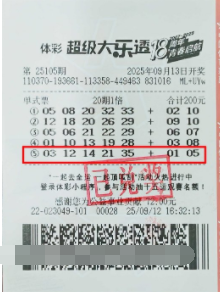 10月11日,超级大乐透第25115期开奖,前区号码为03、12、14、21、35,后区号码为01、05。全国共中出3注一等奖,每注奖金1000万元,其中一注由临沂的李先生(化名)摘得。