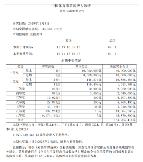 北京时间11月3日晚,体彩大乐透第25125期开奖,当期开奖号码为前区10 11 13 19 35,后区04 11。