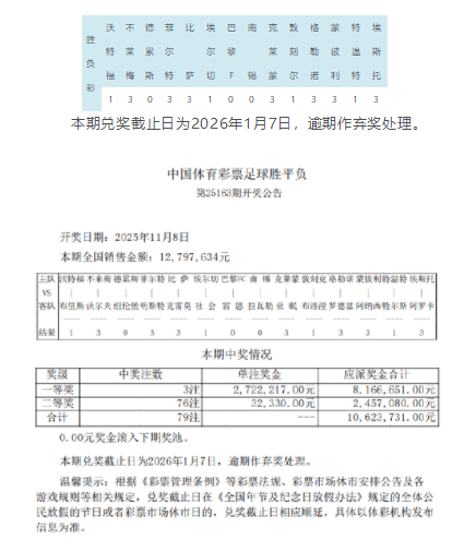 北京时间11月8日,胜负彩第25163期开奖结果揭晓。本期足彩头奖开出3注,单注奖金2,722,217元,243万余元滚存被清空。二等奖开出76注,单注奖金32,330元;任九开出414注,单注奖金22,106元。本期足彩销量为12,797,634元,任九投注总额为14,299,968元。