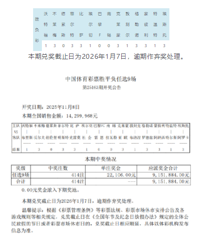 北京时间11月8日,胜负彩第25163期任九开奖结果揭晓。本期任九开出414注,单注奖金22,106元。本期任九投注总额14,299,968元。