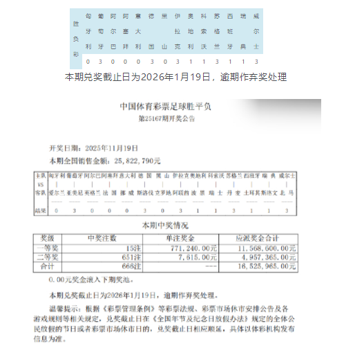 北京时间11月19日,胜负彩第25167期开奖结果揭晓。14场1等开出15注,单注奖金77.1万元,14场2等开出651注,单注奖金7615元。任九开出7578注,单注奖金1171元。本期14场销量为25,822,790元,任九投注总额为13,866,100元。