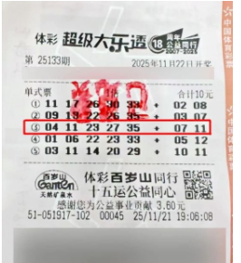 11月22日,超级大乐透第25133期开奖,前区号码为04、11、23、27、35,后区号码为07、11。本市一位幸运彩民凭借一张10元的5注直选单式彩票,成功中得1注基础一等奖,奖金902万余元。该张彩票来自位于浦东新区新金桥路738号5F啦啦宝都的市属51917网点。