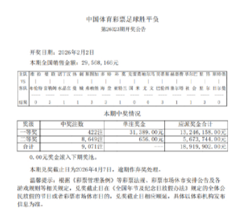 北京时间2月2日,足彩第26023期开奖结果揭晓。本期足彩头奖井喷422注,单注奖金31,389元;14场2等开出8,649注,单注奖金656元;任九开出40,337注,单注奖金358元。本期14场销量为29,568,166元,任九投注总额为22,593,390元。