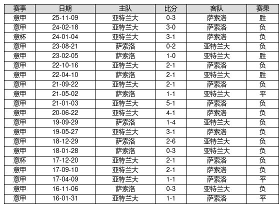 萨索洛 VS 亚特兰大两队近10年的交战次数为20场,萨索洛3胜3平14负,赢球概率为15.0%,平局概率为15.0%,输球概率为70.0%。
