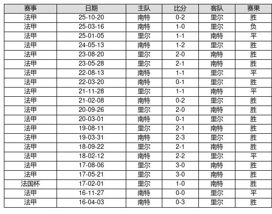 里尔 VS 南特两队近10年的交战次数为21场,里尔15胜5平1负,赢球概率为71.4%,平局概率为23.8%,输球概率为4.8%。