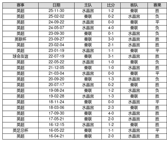曼联 VS 水晶宫两队近10年的交战次数为23场,曼联12胜5平6负,赢球概率为52.2%,平局概率为21.7%,输球概率为26.1%。