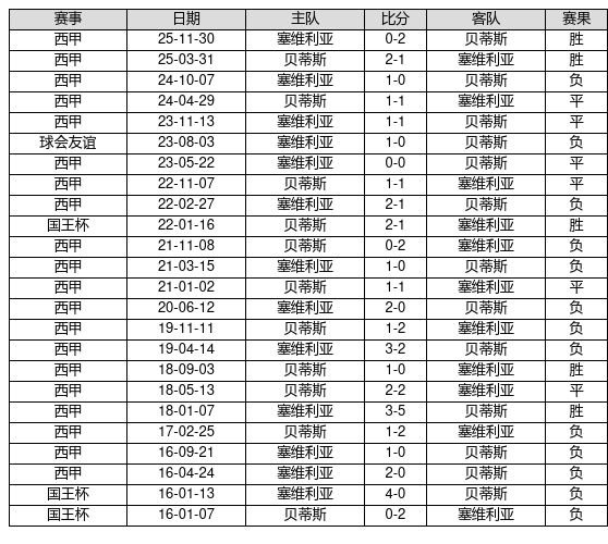 贝蒂斯 VS 塞维利亚两队近10年的交战次数为24场,贝蒂斯5胜6平13负,赢球概率为20.8%,平局概率为25.0%,输球概率为54.2%。
