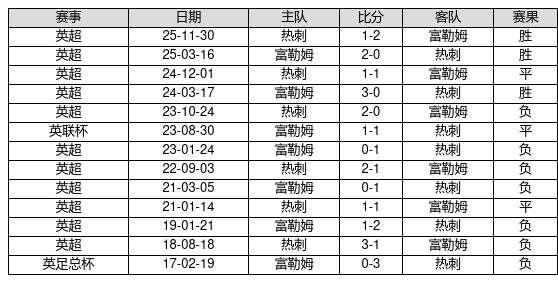 富勒姆 VS 热刺两队近10年的交战次数为13场,富勒姆3胜3平7负,赢球概率为23.1%,平局概率为23.1%,输球概率为53.8%。