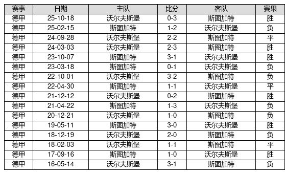 斯图加特 VS 沃尔夫斯堡两队近10年的交战次数为16场,斯图加特6胜3平7负,赢球概率为37.5%,平局概率为18.8%,输球概率为43.8%。