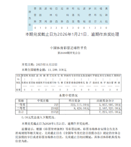 北京时间11月22日,胜负彩第25168期开奖结果揭晓。14场1等开出7注,单注奖金722,515元。14场2等开出230注,单注奖金9424元。任九开出2855注,单注奖金3176元。本期14场销量为11,289,308元,任九投注总额为14,171,858元。