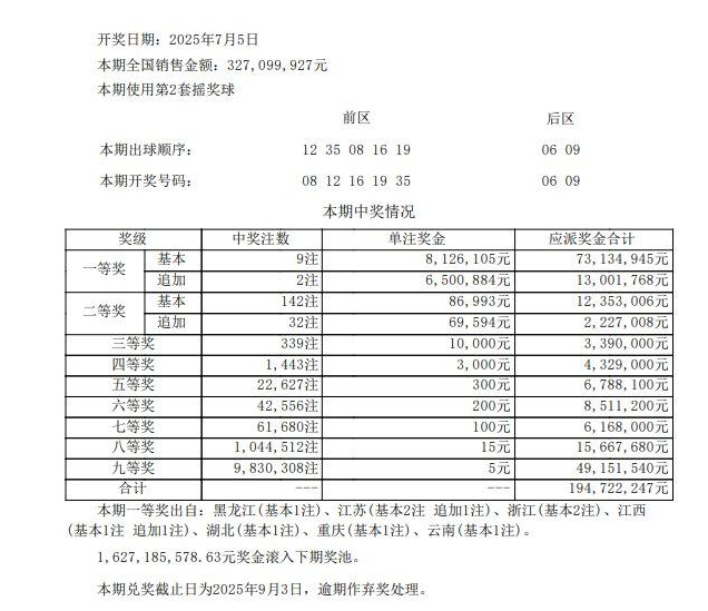 7月5日晚,体彩大乐透第25075期开奖,全国共开出9注一等奖,每注奖金约为812万元,其中2注采用追加投注,每注额外赢得650万元。这2注追加投注头奖分别来自江苏和江西,剩余7注基本头奖分布在6个省份,其中浙江中得2注,黑龙江、江苏、湖北、重庆、云南各中得1注。二等奖开出142注,单注奖金超过8.6万元,其中32注为追加投注,额外奖金为6.9万元。
