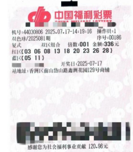 7月17日,中国福利彩票双色球第2025081期开奖,珠海市香洲区前山岱山路鑫洲花园44030806号福彩销售站点中得一注一等奖。中奖彩票是一张单倍“9+2”复式彩票,除了1注一等奖外,还中得了1注二等奖、18注三等奖、63注四等奖和65注五等奖,累计奖金超过865万元。7月18日,大奖得主王先生(化名)与妻子一同前往珠海市福彩中心办理兑奖手续。
