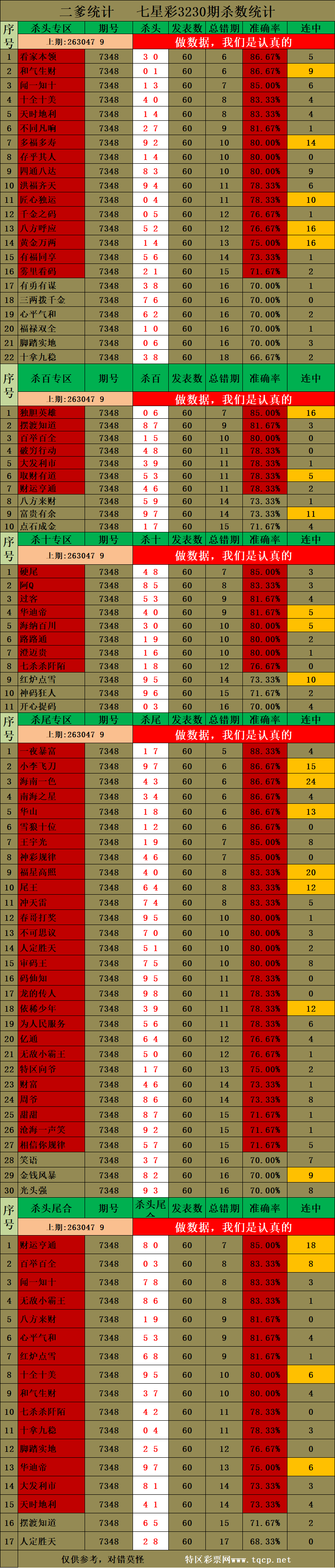 3230期:二爹统计 发表于:2025-08-23 12:02:36 浏览次数:457 上一篇:3230期:红哥统计 下一篇:七星彩3230期点播推荐取财有道、黑猫警长和华山 3位分析师 【笑语】 范围码15红10 点播25326期 【天时地利】 范围码15红9 点播25326期 【无敌通杀】 范围码15红9 点播25326期 排列五杀码荣誉榜