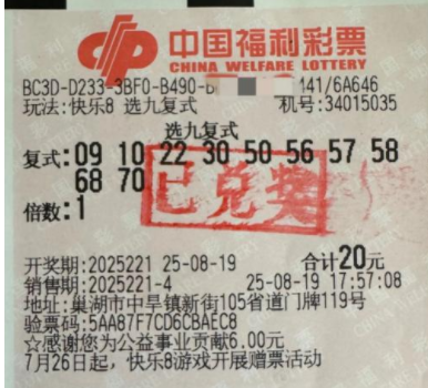 8月19日晚,福彩快乐8游戏第2025221期开奖,巢湖市中旱镇的福彩34015035号销售网点传来好消息。一位幸运购彩者凭借一张价值20元的机选选九复式票,成功摘得31.8万元大奖。