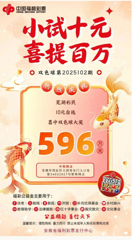 在幸运的九月,双色球再次传来喜讯!9月4日晚,福彩双色球第2025102期开奖,芜湖市一位购彩者仅花费10元购买自选票,便幸运中得双色球一等奖,收获了596万元的大奖。