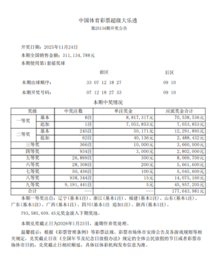北京时间11月24日晚,体彩大乐透第25134期开奖,当期开奖号码为前区07 12 18 27 33,后区09 10。