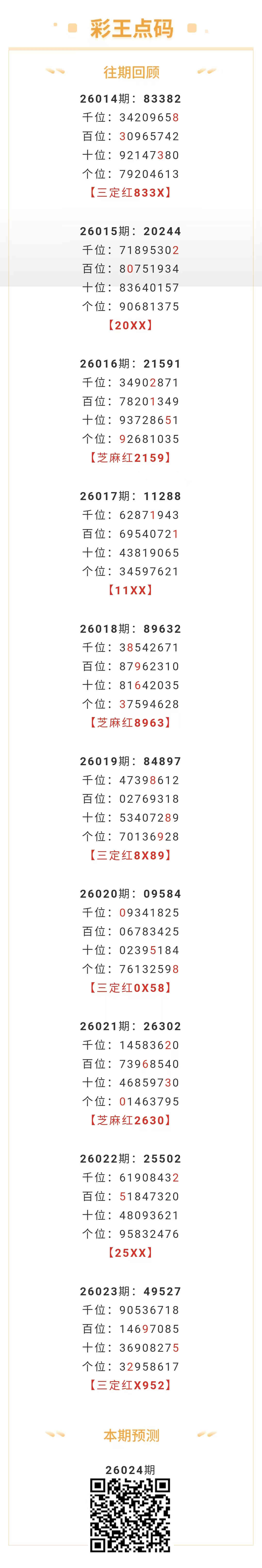 【排列五-26024期】本月圈红7次芝麻,芝麻近10红3;上期三定红X952 发表于:2026-01-24 12:18:26 浏览次数:326 上一篇: 下一篇:没有了 【主攻头】 范围码15红10 点播26029期 【春哥打奖】 范围码15红10 点播26029期 【金山银山】 范围码15红9 点播26029期 排列五杀码荣誉榜