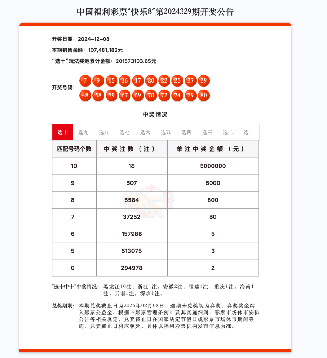 在12月8日的晚上,中国福利彩票“快乐8”游戏第2024329期开奖全国中出18注“选十中十”单注奖金500万元。