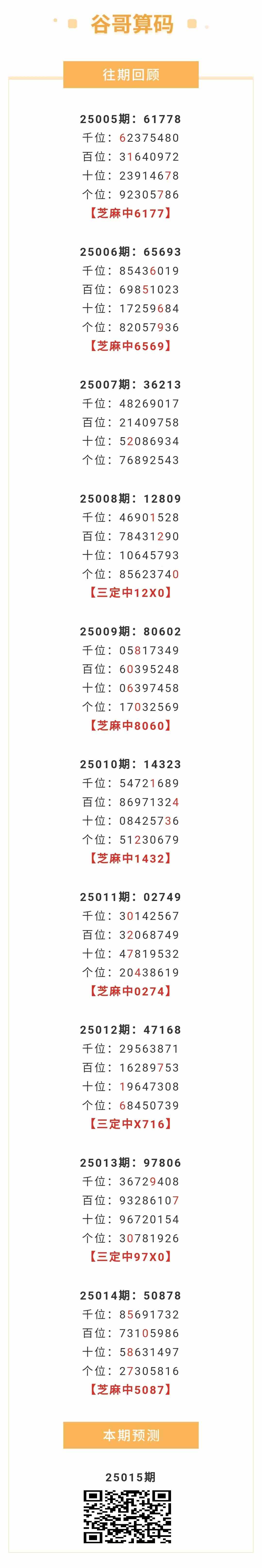 【排列五-25015期】本月圈中8次芝麻,芝麻近10中6;上期芝麻中5087,新期好码趁热打铁! 发表于:2025-01-15 12:22:20 浏览次数:638 上一篇: 下一篇:没有了 【春哥打奖】 范围码15红11 点播26030期 【天意人生】 范围码15红9 点播26030期 【彩女】 范围码15红9 点播26030期 排列五杀码荣誉榜
