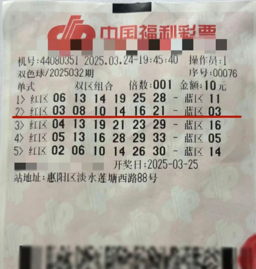 2023年3月25日,中国福利彩票双色球游戏第2025032期开奖,当期全国共中出6注一等奖,其中一注落在惠州市惠阳区淡水莲塘西路44080351号福彩销售站。这张中奖彩票是一张10元单式机选票,中奖奖金为794万元。这也是今年惠州的第3注双色球一等奖。
