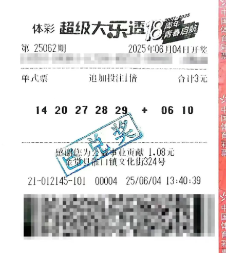 2025年6月4日,体彩超级大乐透第25062期开奖,金堂县淮口镇文化街324号(编号21-012145-101)站点传来了振奋人心的消息,一位幸运购彩者凭借仅3元的单式追加投注,成功摘得大奖。幸运的数字组合为前区14、20、27、28、29,后区06、10,简单的选号方式竟为这位购彩者带来了1800万的大奖。6月9日,中奖者现身体彩兑奖中心,激动地领取了属于自己的幸运奖金。