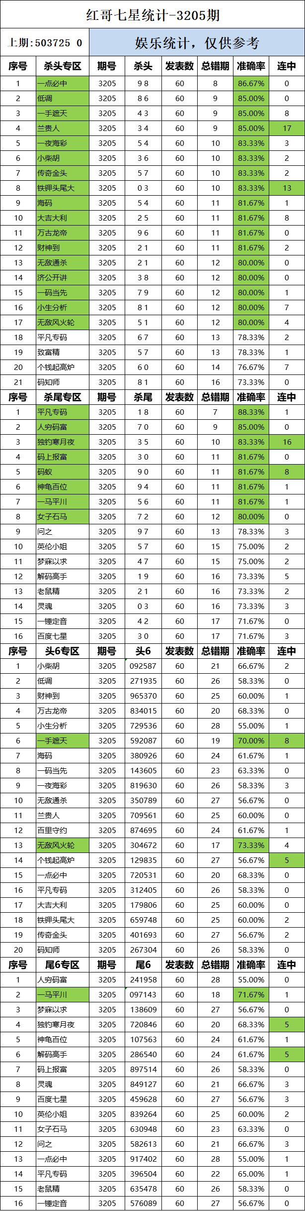 3205期:红哥统计 发表于:2025-06-25 12:03:14 浏览次数:470 上一篇: 下一篇:3205期:二爹统计 【春哥打奖】 范围码14红11 更新中 【天意人生】 范围码14红9 更新中 【彩女】 范围码14红9 更新中 排列五杀码荣誉榜