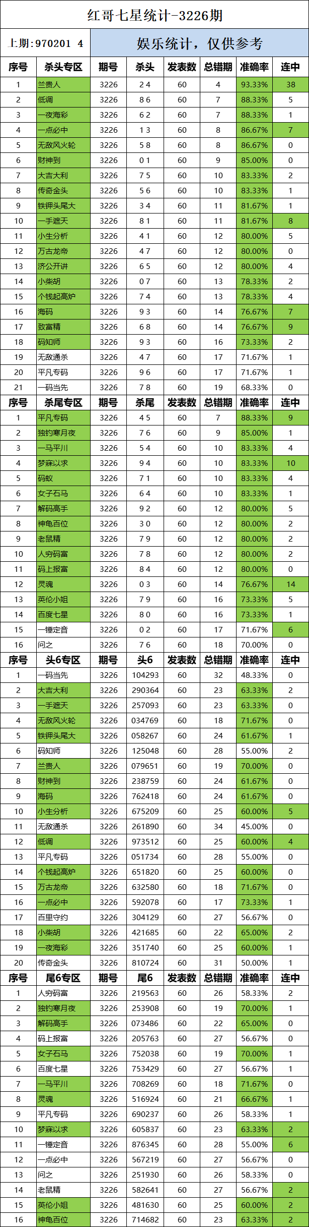 3226期:红哥统计 发表于:2025-08-13 11:00:52 浏览次数:451 上一篇:3226期:二爹统计 下一篇:3226期:二爹统计 【主攻头】 范围码15红10 点播26029期 【春哥打奖】 范围码15红10 点播26029期 【金山银山】 范围码15红9 点播26029期 排列五杀码荣誉榜