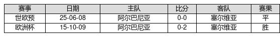 塞尔维亚 VS 阿尔巴尼亚两队近10年的交战次数为2场,塞尔维亚1胜1平0负,赢球概率为50.0%,平局概率为50.0%,输球概率为0.0%。