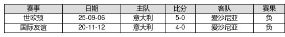 爱沙尼亚 VS 意大利两队近10年的交战次数为2场,爱沙尼亚0胜0平2负,赢球概率为0.0%,平局概率为0.0%,输球概率为100.0%。