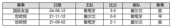 葡萄牙 VS 爱尔兰两队近10年的交战次数为3场,葡萄牙2胜1平0负,赢球概率为66.7%,平局概率为33.3%,输球概率为0.0%。