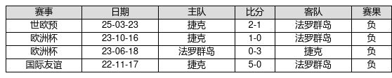 法罗群岛 VS 捷克两队近10年的交战次数为4场,法罗群岛0胜0平4负,赢球概率为0.0%,平局概率为0.0%,输球概率为100.0%。