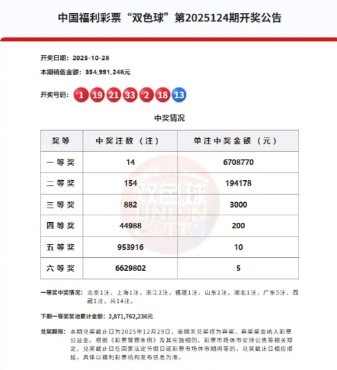 10月28日,福彩双色球第2025124期开奖,我区传来喜讯——拉萨市54010270号销售网点中出1注一等奖,中奖金额高达670.877万元,为当地再添一位幸运儿。