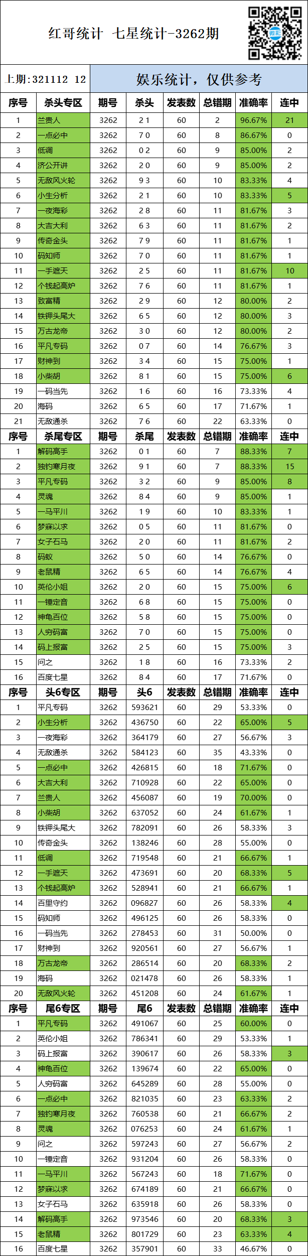 3262期:红哥统计 发表于:2025-11-08 11:30:58 浏览次数:390 上一篇:3262期:二爹统计 下一篇:3262期:二爹统计 【主攻头】 范围码15红10 点播26029期 【春哥打奖】 范围码15红10 点播26029期 【金山银山】 范围码15红9 点播26029期 排列五杀码荣誉榜