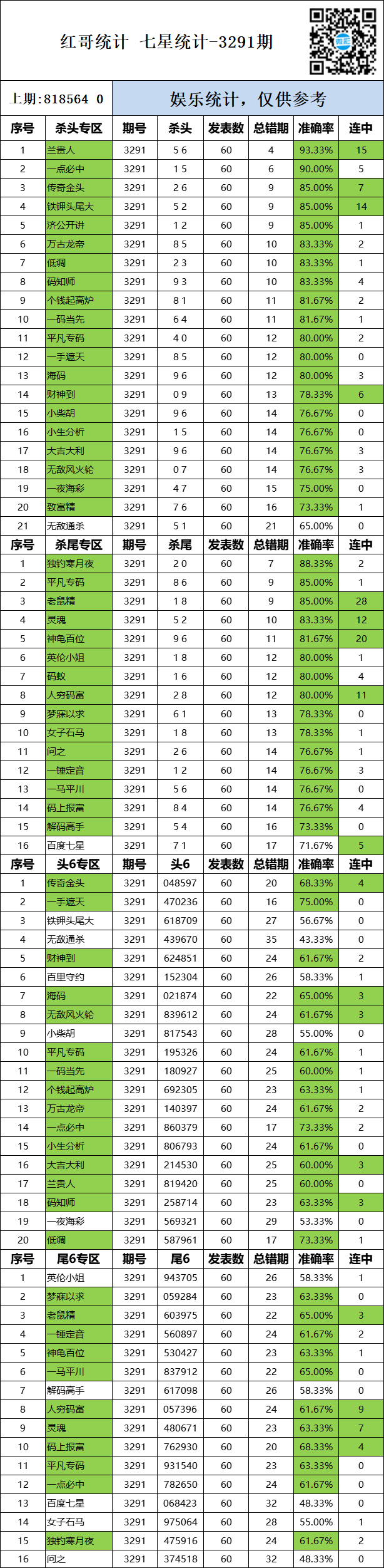 3291期:红哥统计 发表于:2026-01-14 11:30:43 浏览次数:371 上一篇:3291期:二爹统计 下一篇:3291期:二爹统计 【主攻头】 范围码15红10 点播26029期 【春哥打奖】 范围码15红10 点播26029期 【金山银山】 范围码15红9 点播26029期 排列五杀码荣誉榜