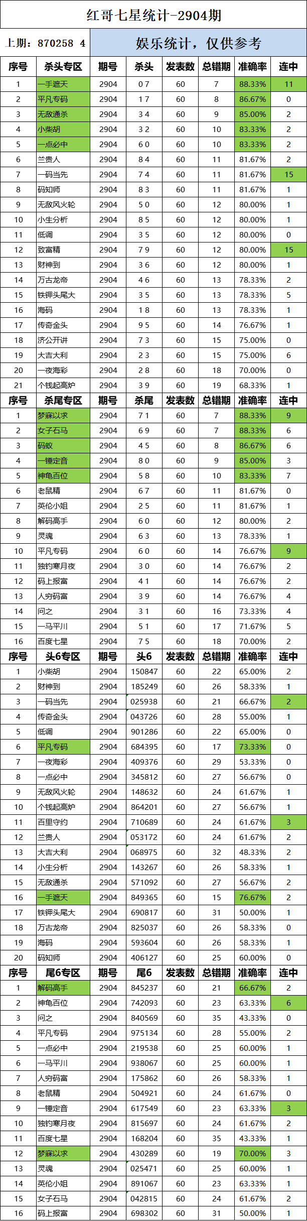 2904期:红哥统计 发表于:2023-06-26 12:01:09 浏览次数:1423 上一篇:2904期:七星出号统计 下一篇:2904期:二爹统计 【春哥打奖】 范围码15红11 点播26030期 【天意人生】 范围码15红9 点播26030期 【彩女】 范围码15红9 点播26030期 排列五杀码荣誉榜