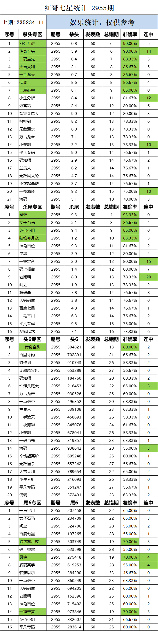 2955期:红哥统计 发表于:2023-10-28 12:01:59 浏览次数:2882 上一篇:七星彩2955期特区杀三头三尾统计 下一篇:2955期:二爹统计 【春哥打奖】 范围码15红11 点播26030期 【天意人生】 范围码15红9 点播26030期 【彩女】 范围码15红9 点播26030期 排列五杀码荣誉榜