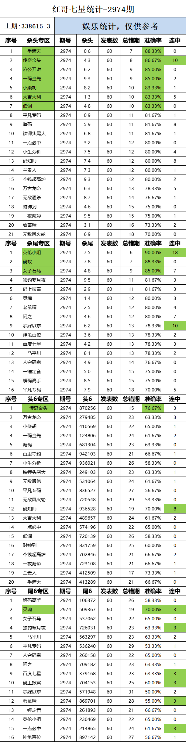 2974期:红哥统计 发表于:2023-12-11 10:32:00 浏览次数:840 上一篇:排列五23331期点播推荐红炉点雪、宝慧和南海之星 3位分析师 下一篇:2974期:二爹统计 【春哥打奖】 范围码15红11 点播26030期 【天意人生】 范围码15红9 点播26030期 【彩女】 范围码15红9 点播26030期 排列五杀码荣誉榜