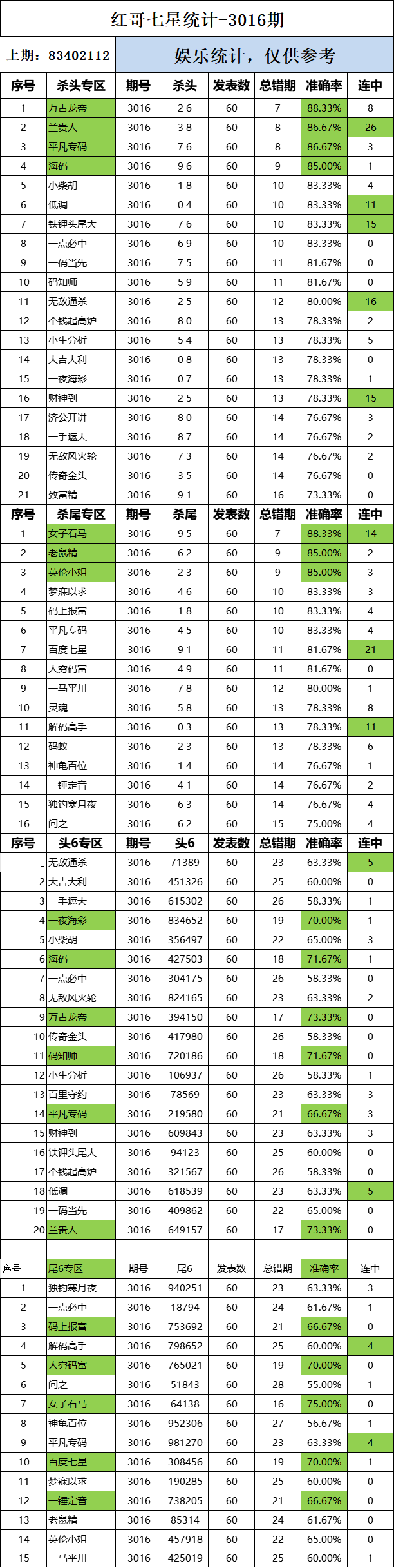 3016期:红哥统计 发表于:2024-03-27 12:32:22 浏览次数:706 上一篇:3016期:红哥统计 下一篇:3016期:二爹统计 【春哥打奖】 范围码15红11 点播26030期 【天意人生】 范围码15红9 点播26030期 【彩女】 范围码15红9 点播26030期 排列五杀码荣誉榜