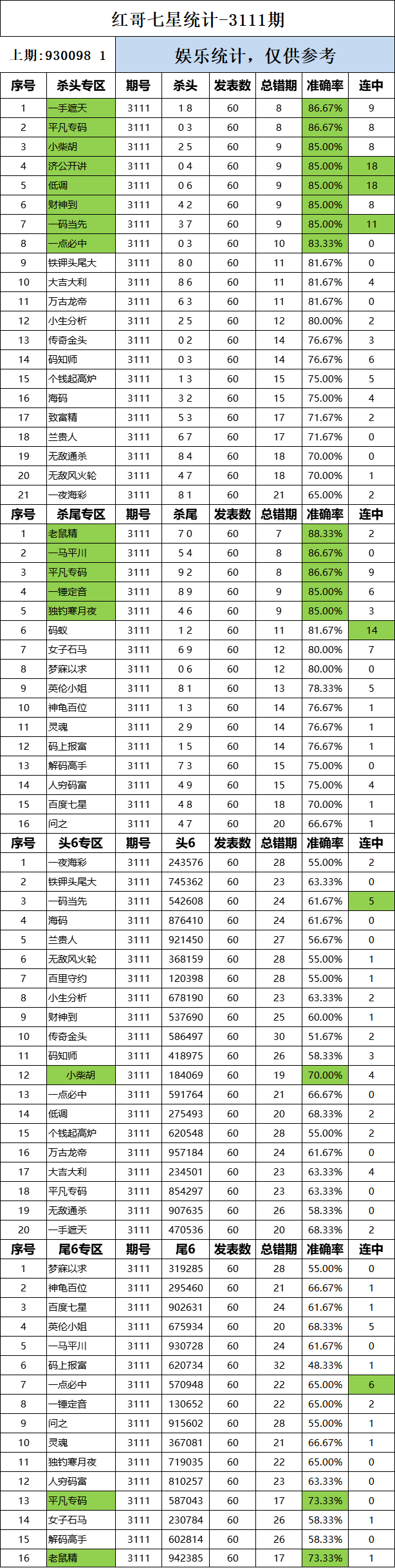 3111期:红哥统计 发表于:2024-11-09 10:03:13 浏览次数:763 上一篇:七星彩3111期特区杀三头三尾统计 下一篇:3111期:二爹统计 【春哥打奖】 范围码15红11 点播26030期 【天意人生】 范围码15红9 点播26030期 【彩女】 范围码15红9 点播26030期 排列五杀码荣誉榜