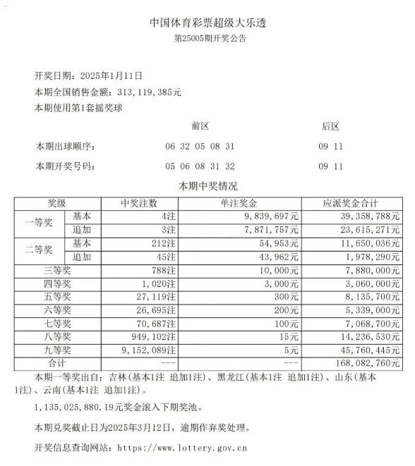 云南一位幸运彩民近日中得了超过1771万元的大奖 发表于:2025-01-25 10:45:15 浏览次数:735 根据“云南体彩”微信公众号的消息,超级大乐透第25005期一等奖分别来自吉林(基本1注 追加1注)、黑龙江(基本1注 追加1注)、山东(基本1注)和云南(基本1注 追加1注)。云南的大奖出自5309020069101终端,实体店地址为玉溪市红塔区白龙路金科桃李郡5号商铺。云南的奖金总额为17711454元。 上一篇:男子坚持每周购买彩票10年之久,最终赢得了100万美元的大奖 下一篇:七星彩3144期特区杀三头三尾统计 【春哥打奖】 范围码15红11 点播26030期 【天意人生】 范围码15红9 点播26030期 【彩女】 范围码15红9 点播26030期 排列五杀码荣誉榜