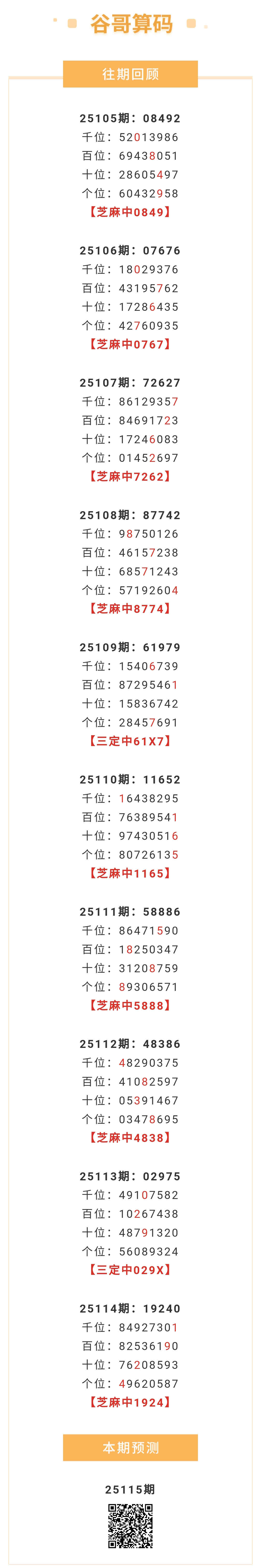 【排列五-115期】本月圈中3次芝麻,芝麻近10中8;上期芝麻中1924 发表于:2025-05-05 11:39:23 浏览次数:445 上一篇: 下一篇:没有了 【春哥打奖】 范围码15红11 点播26030期 【天意人生】 范围码15红9 点播26030期 【彩女】 范围码15红9 点播26030期 排列五杀码荣誉榜