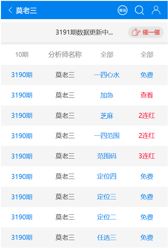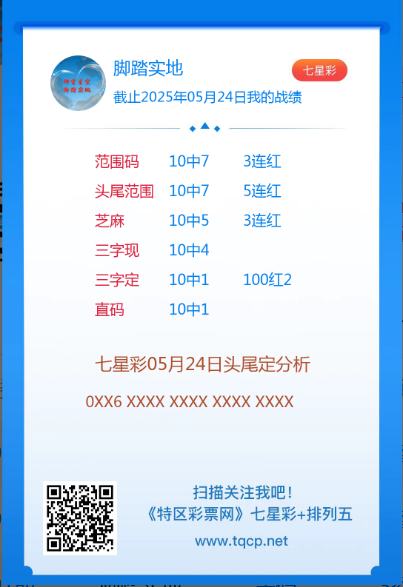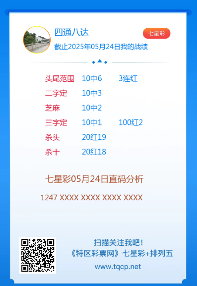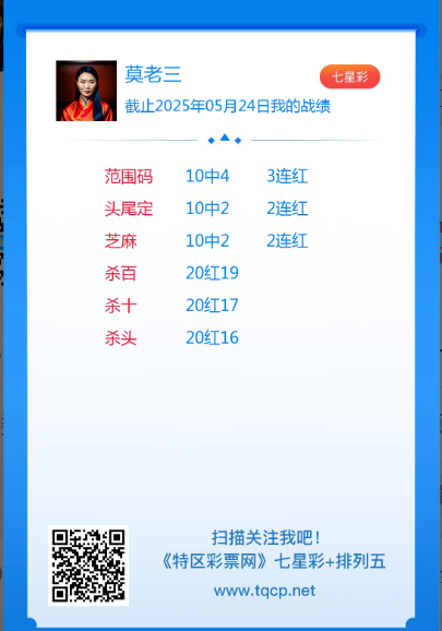 七星彩3191期点播推荐脚踏实地、四通八达和莫老三 3位分析师 发表于:2025-05-24 15:52:21 浏览次数:571 上一篇:排列五25134期点播推荐徐艾艾,一锤定音和求财有道 3位分析师 下一篇:25134期:吉星高照 【春哥打奖】 范围码15红11 点播26030期 【天意人生】 范围码15红9 点播26030期 【彩女】 范围码15红9 点播26030期 七星彩杀码荣誉榜