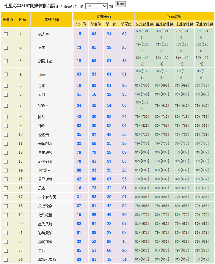 七星彩3197期特区杀二头二尾统计 发表于:2025-06-07 15:48:28 浏览次数:545 上一篇:七星彩3197期特区杀一头一尾统计 下一篇:七星彩3197期特区杀三头三尾统计 【春哥打奖】 范围码15红11 点播26030期 【天意人生】 范围码15红9 点播26030期 【彩女】 范围码15红9 点播26030期 七星彩杀码荣誉榜