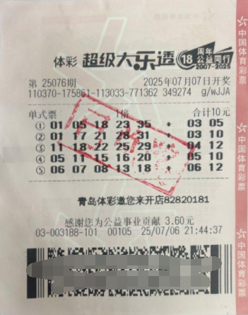 7月7日,超级大乐透第25076期开奖,前区号码为11、18、22、25、29,后区号码为04、12。全国共中出7注一等奖,其中山东青岛中得1注基本投注一等奖,奖金为1000万元。7月9日下午,大奖得主刘女士(化姓)在家人的陪同下前往体彩中心领取奖金。刘女士购买的是一张包含5注号码的单式票,其中第三注号码命中了当期一等奖,幸运获得1000万元大奖。