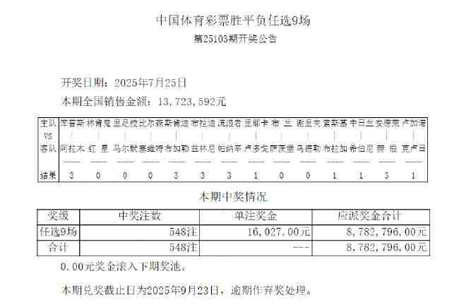 马尔默4-1大胜北京时间7月25日,胜负彩第25103期任九开奖结果揭晓。本期任九开出548注,单注奖金16,027元。本期任九投注总额为13,723,592元。