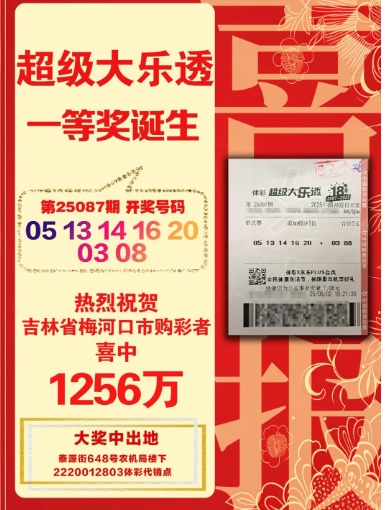 8月2日,超级大乐透第25087期开奖,前区号码为05、13、14、16、20,后区号码为03、08。此次开奖中,梅河口市泰源街648号农机局楼下2220012803体彩代销点售出的一注追加投注一等奖幸运中出。8月4日一早,中奖者张先生(化名)前来吉林省体育彩票管理中心办理兑奖手续。