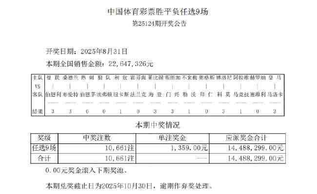 北京时间8月31日,胜负彩第25124期任九开奖结果揭晓。本期任九开出10,661注,单注奖金1,359元。本期任九投注总额为22,647,326元。
