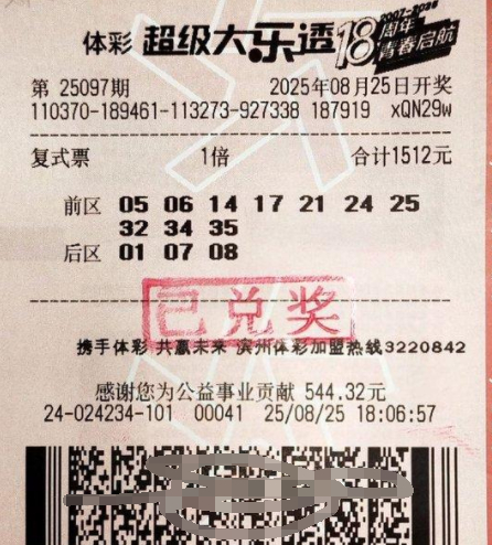 8月25日,超级大乐透第25097期开奖,前区号码为05、24、25、32、34,后区号码为01、09。当期全国共中出一等奖8注。来自滨州的幸运购彩者黄先生(化姓)凭借一张10+3复式票,中得二等奖2注、三等奖1注及其他若干奖级,奖金合计595400元。